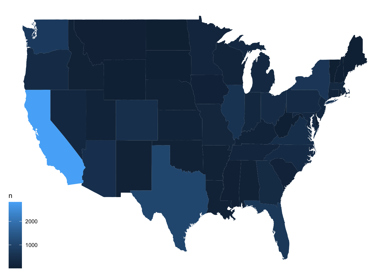 Links map regions with data set with info about regions and plots it | ggplot(starbucks_us_by_state) + geom_map(map = states_map,aes(map_id = state_name,fill = n)) |